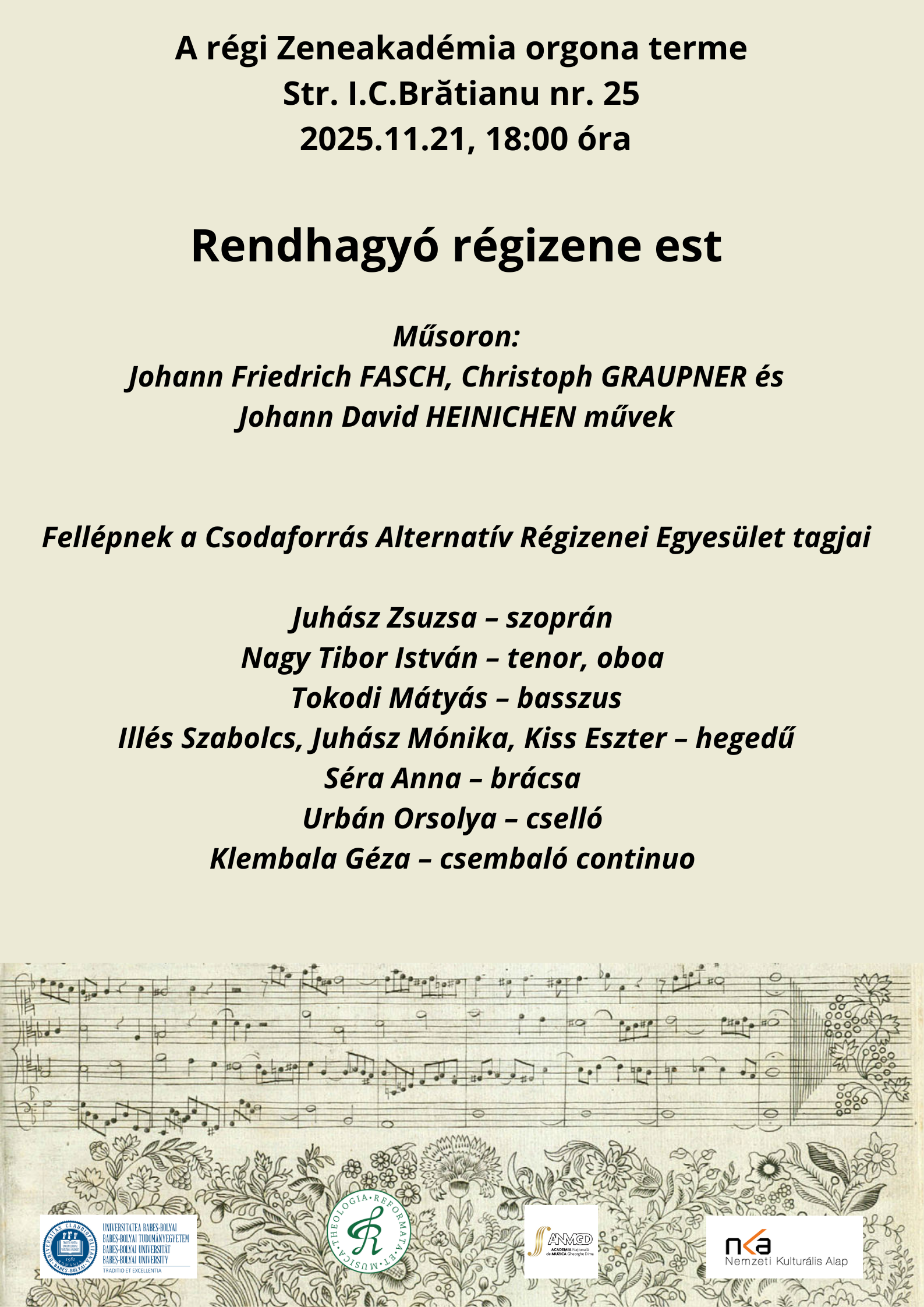 Szeretettel várunk minden kedves érdeklődőt a Gheorghe Dima Zeneakadémia régi épületében található orgona terembe, 2025. november 21-én, 18:00 órai kezdettel, ahol egy rendhagyó régizene hangversenyre kerül sor a a Csodaforrás Alternatív Régizenei Egyesület előadásában.