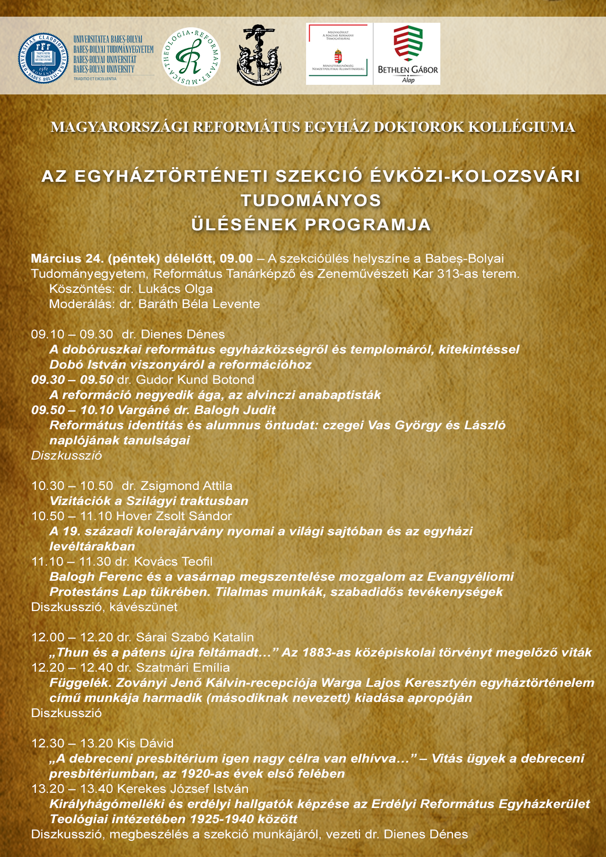 Március 24. (péntek) délelőtt, 09.00 – A szekcióülés helyszíne a Babeș-Bolyai Tudományegyetem, Református Tanárképző és Zeneművészeti Kar 313-as terem.