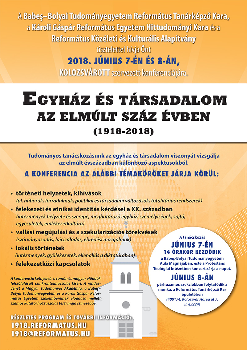 Egyház és társadalom az elmúlt száz évben címmel szervezett tudományos tanácskozást a Babeș–Bolyai Tudományegyetem Református Tanárképző Kara, a Károli Gáspár Református Egyetem Hittudományi Kara és a Református Közéleti és Kulturális Alapítvány június 7–8-án Kolozsváron. A két nyelven zajló rendezvényen számos jeles kutató, erdélyiek, magyarországiak, román és magyar szakemberek egyaránt tartottak előadást az egyház és társadalom kihívásairól az utóbbi száz évben.