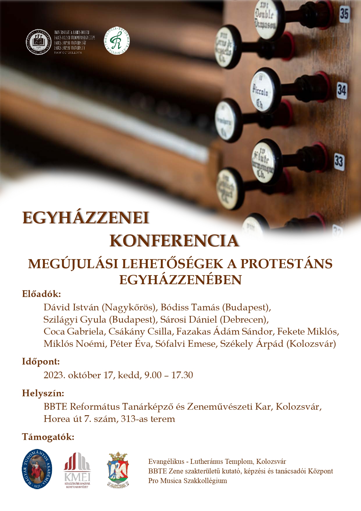 Helyszín: BBTE Református Tanárképző és Zeneművészeti Kar, Kolozsvár, Horea út 7. szám, III. emelet, 313-as terem.