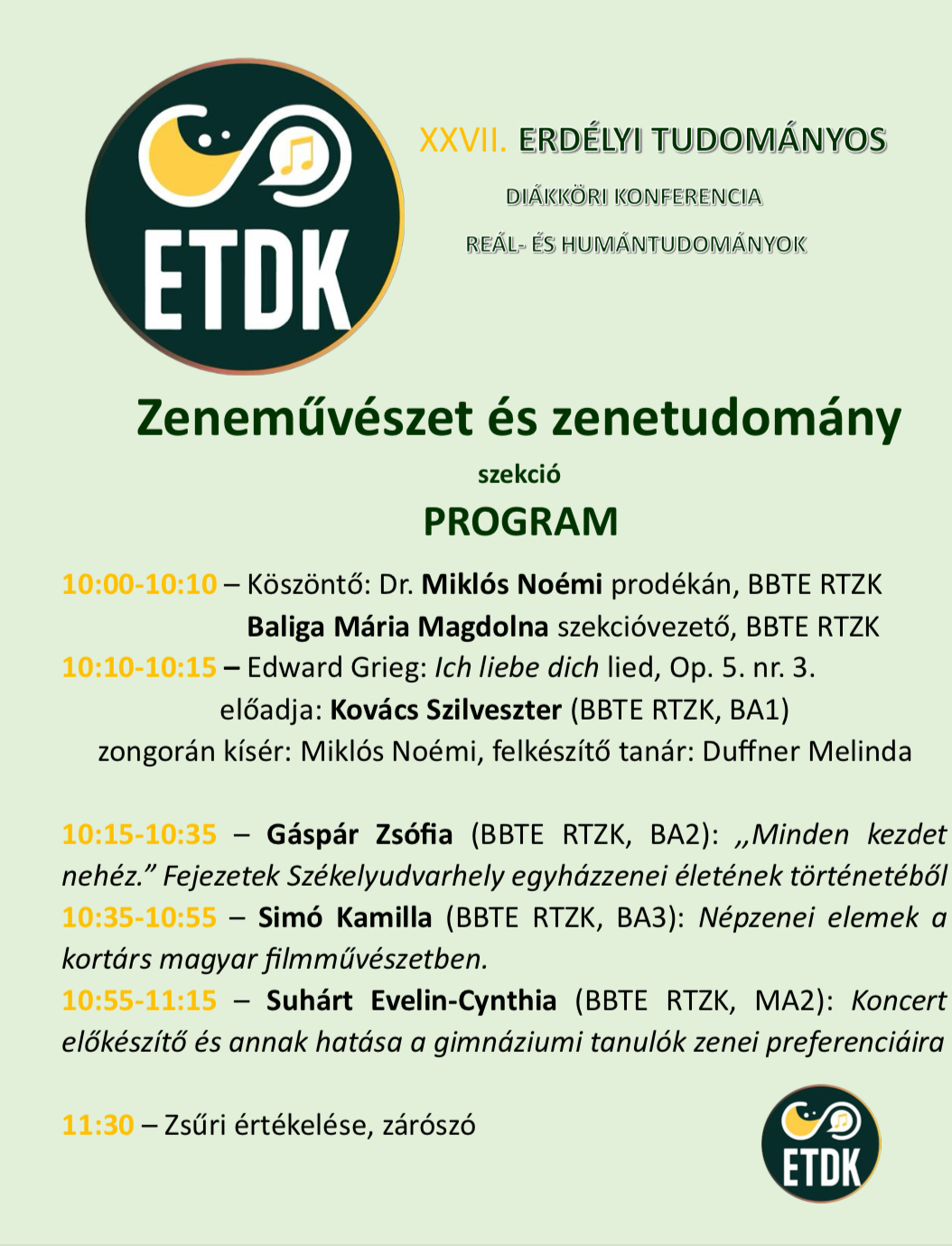 Idén is karunk ad otthont az Erdélyi Tudományos Diákköri Konferencia Zeneművészet és zenetudomány szekciójának. Szeretettel várjuk a diákjaink tudományos munkái iránt érdeklődőket (és a lelkes szurkolókat) 2024. május 17-én, pénteken 10.00 órától a BBTE Református Tanárképző és Zeneművészeti Kar Angi István (313.) termébe.