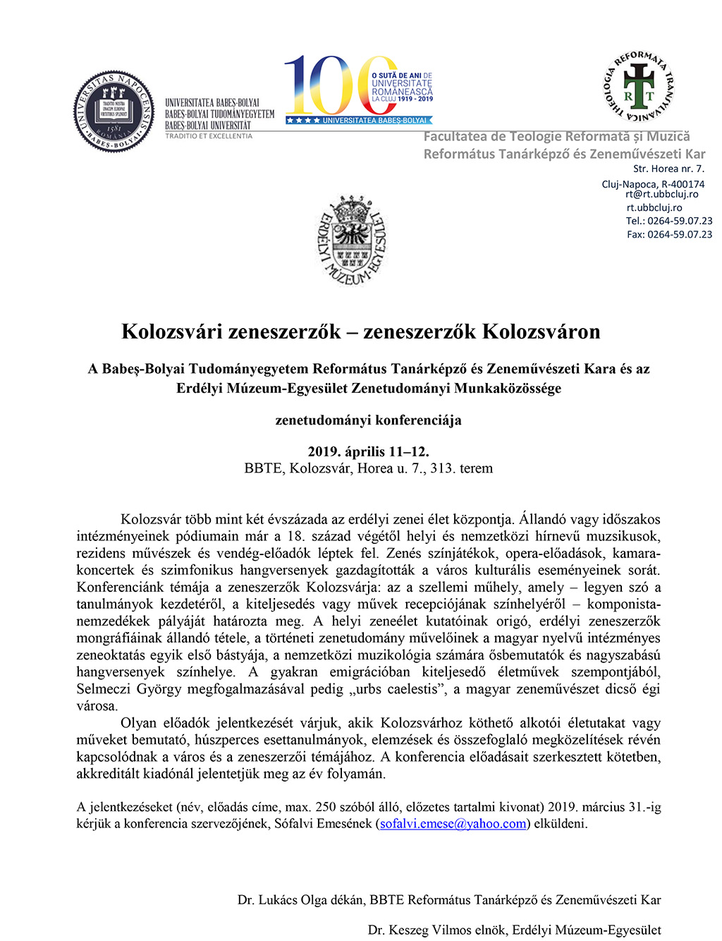 12.00 Megnyitó – Lukács Olga dékán (BBTE Református Tanárképző és Zeneművészeti Kar)