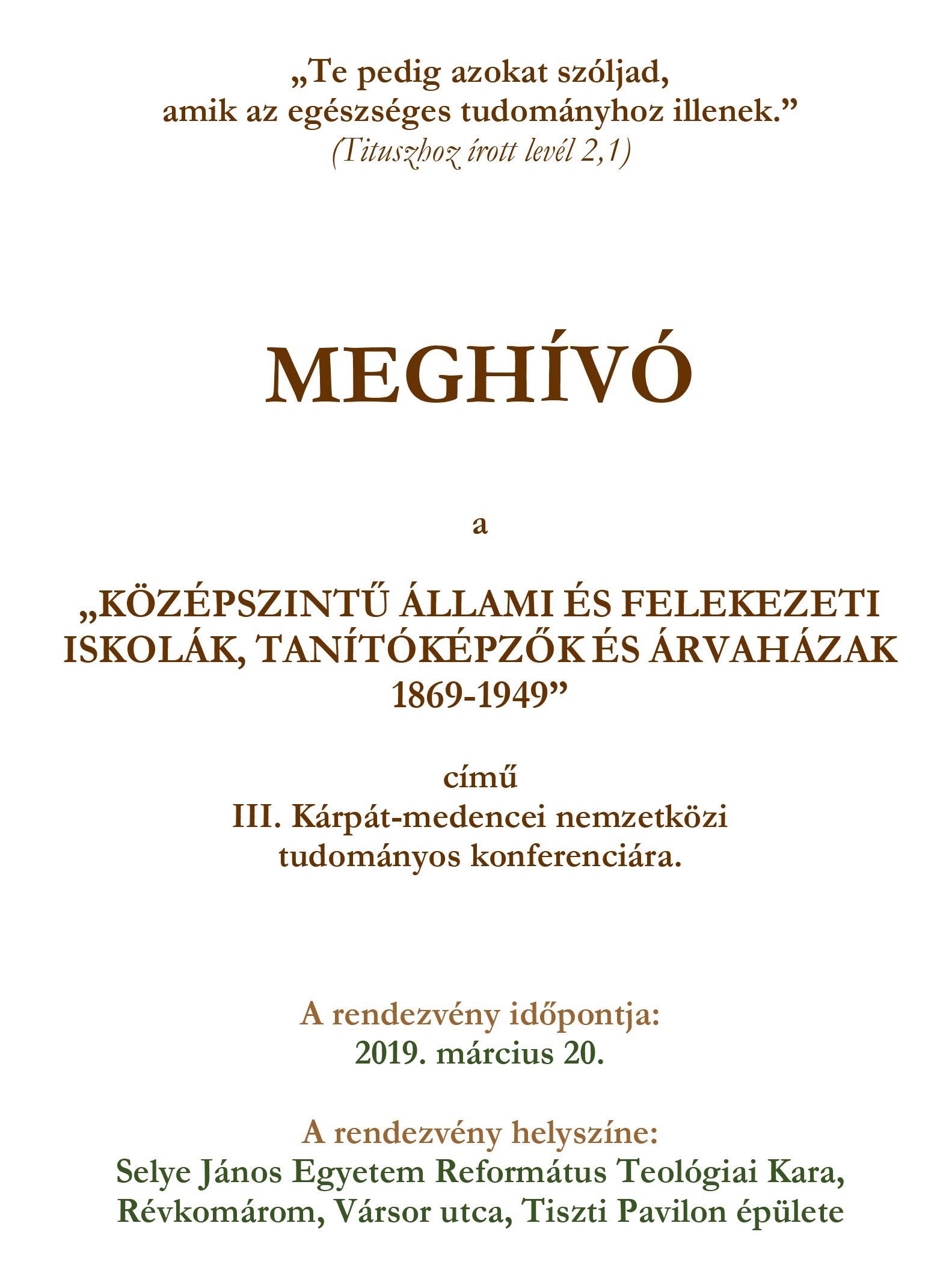 A Selye János Egyetem Református Teológiai Kara, a Babeș-Bolyai Tudományegyetem Református Tanárképző Kara, a Kodolányi János Egyetem, a MTA VETB Neveléstudományi – Magyarságkutató Munkabizottsága és a Százak Tanácsa szervezésében 2019. március 20-21-én tartotta „A magyarság megtartó ereje” témában a III. Kárpát-medencei nemzetközi tudományos konferenciáját.