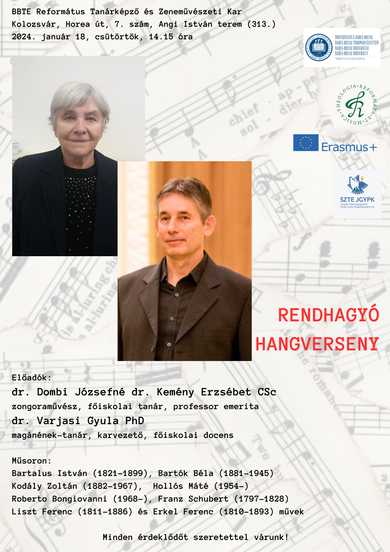 Szeretettel várunk minden kedves érdeklődőt dr. Dombi Józsefné dr. Kemény Erzsébet CSc zongoraművész, főiskolai tanár, professor emerita és dr. Varjasi Gyula PhD magánének-tanár, karvezető, főiskolai docens rendhagyó hangversenyére, melyre csütörtökön, 2024. január 18-án, 14.15 órai kezdettel kerül sor a karunk Angi István termében (313. terem).