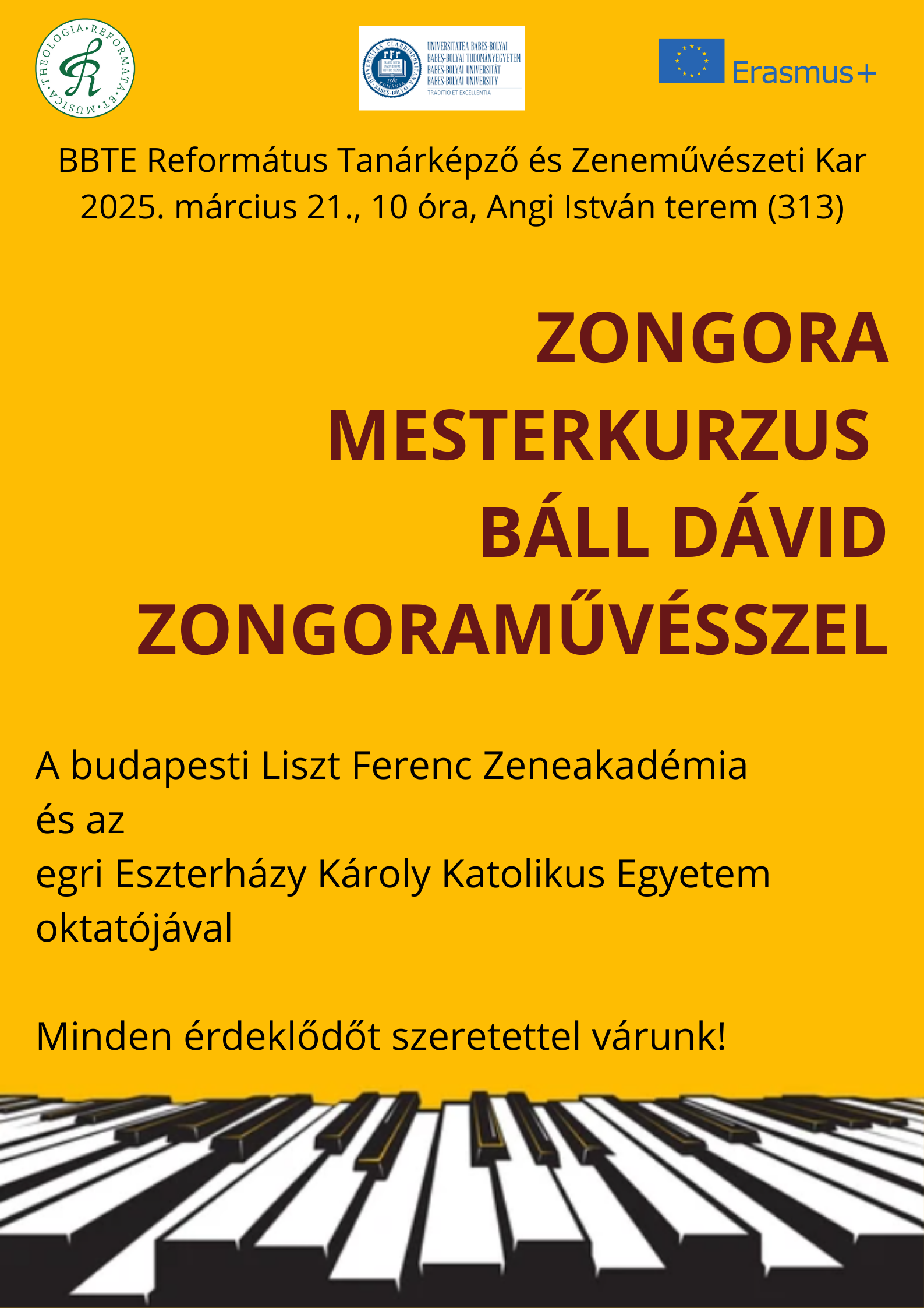 Szeretettel várunk minden kedves érdeklődő zongoristát a Báll Dávid által tartandó zongora mesterkurzusra, melyre a BBTE RTZK Angi István termében (313. terem) kerül sor, 2025. márius 21-én, 9:00 órai kezdettel.